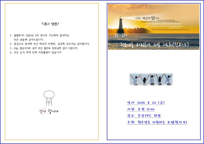 2025.8月22日. 청.사.모(청소년을 사랑하는 모임) 기도회 페이지 정보 작성자유간사 댓글 0건 조회 130회 작성일 25-09-09 14:46 본문 2025.8月22日. 청.사.모 기도회 목록 이전글2025. 8月27日. 水.부흥중 수화동아리/ 담당: 천정숙간사 25.09.12 다음글2025.8月21日. 신곡중 수화동아리/ 담당: 천정숙간사 25.09.09 댓글목록 댓글목록 등록된 댓글이 없습니다.